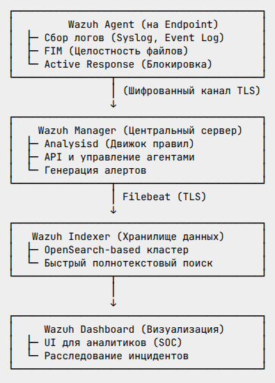 - Функции: Читает локальные логи, следит за изменениями файлов (FIM), проводит инвентаризацию ПО и выполняет команды активного реагирования.